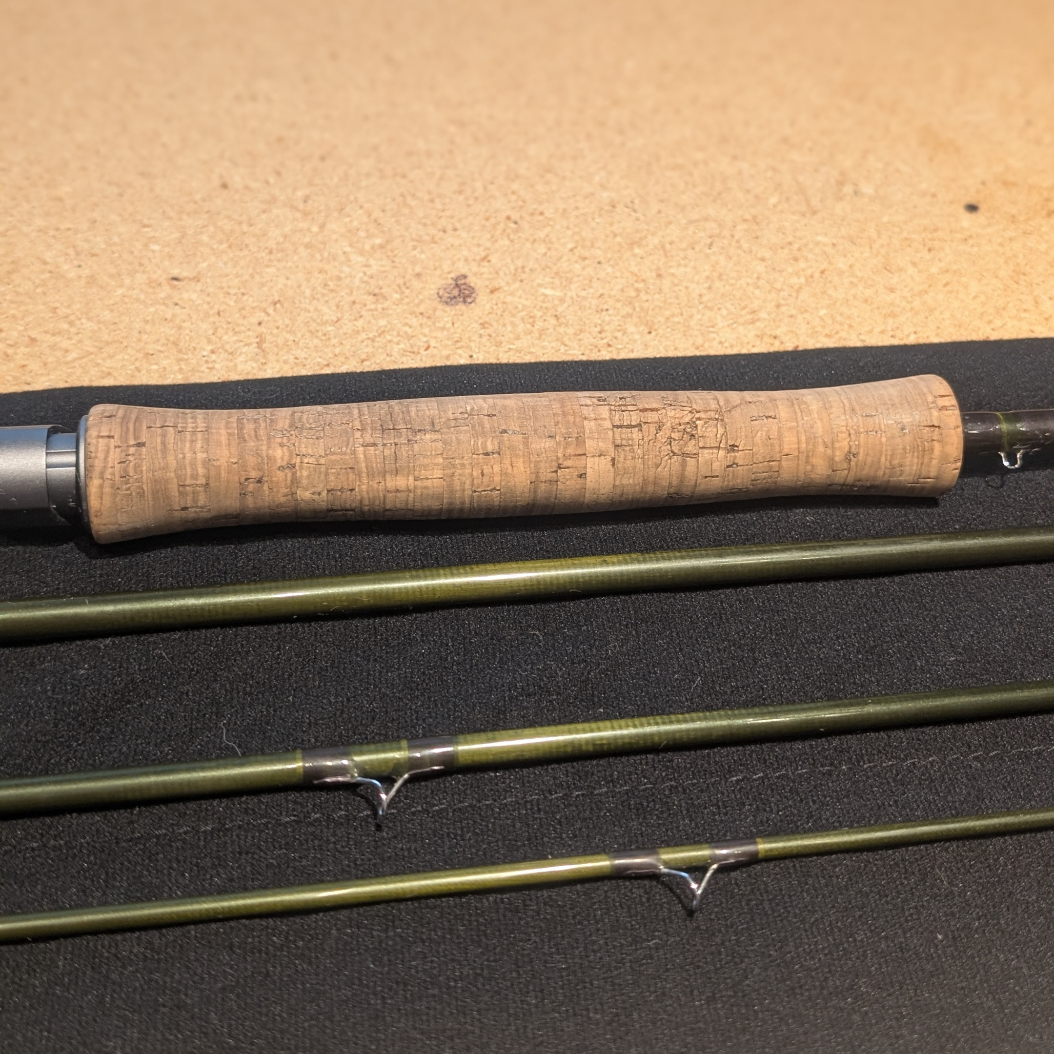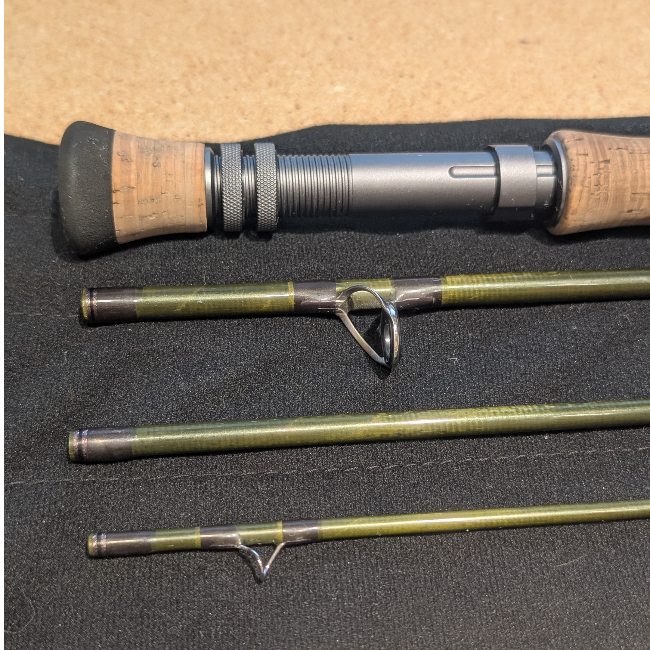 This 9'6" Sage Sonic fly rod is in good used condition. The rod cork is worn and the rod itself shows signs of use. A few small scratches and wear are visible on the rod blank none affecting the working order of the rod. Comes with non original rod sock and original Sage metal tube.