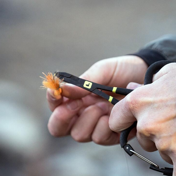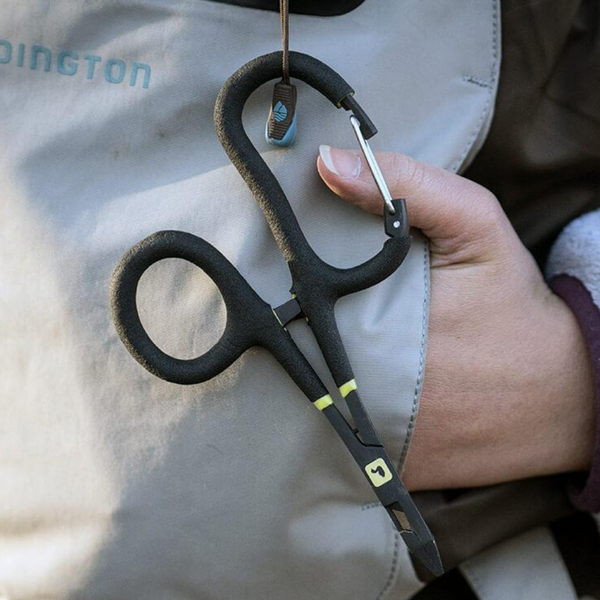 The ultimate hemostat, thoughtfully designed from the tips to the jaws to the handle. A carabiner handle means you can store anywhere and the tight angles and engineered shape accommodate all fly sizes, allow for easy hook removal, and can crimp even the heaviest of barbs. Oversized thumb and finger holes accommodate large or gloved hands, and the compact cutting surface easily clips light or heavy leader.