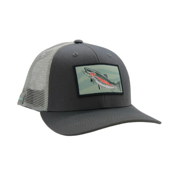 Trucker style hat with mesh back and beautiful rainbow trout sipping a size 36 midge.