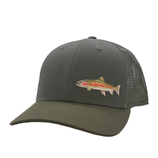 Trucker Style hat with mesh back. Vibrant rainbow trout screen printed on the front.