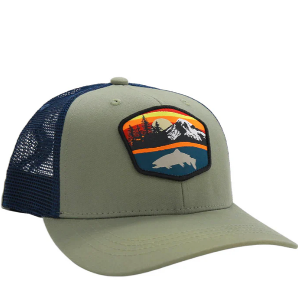 Trucker Style hat with mesh back. Patch depicts last light behind a trout silhouette.